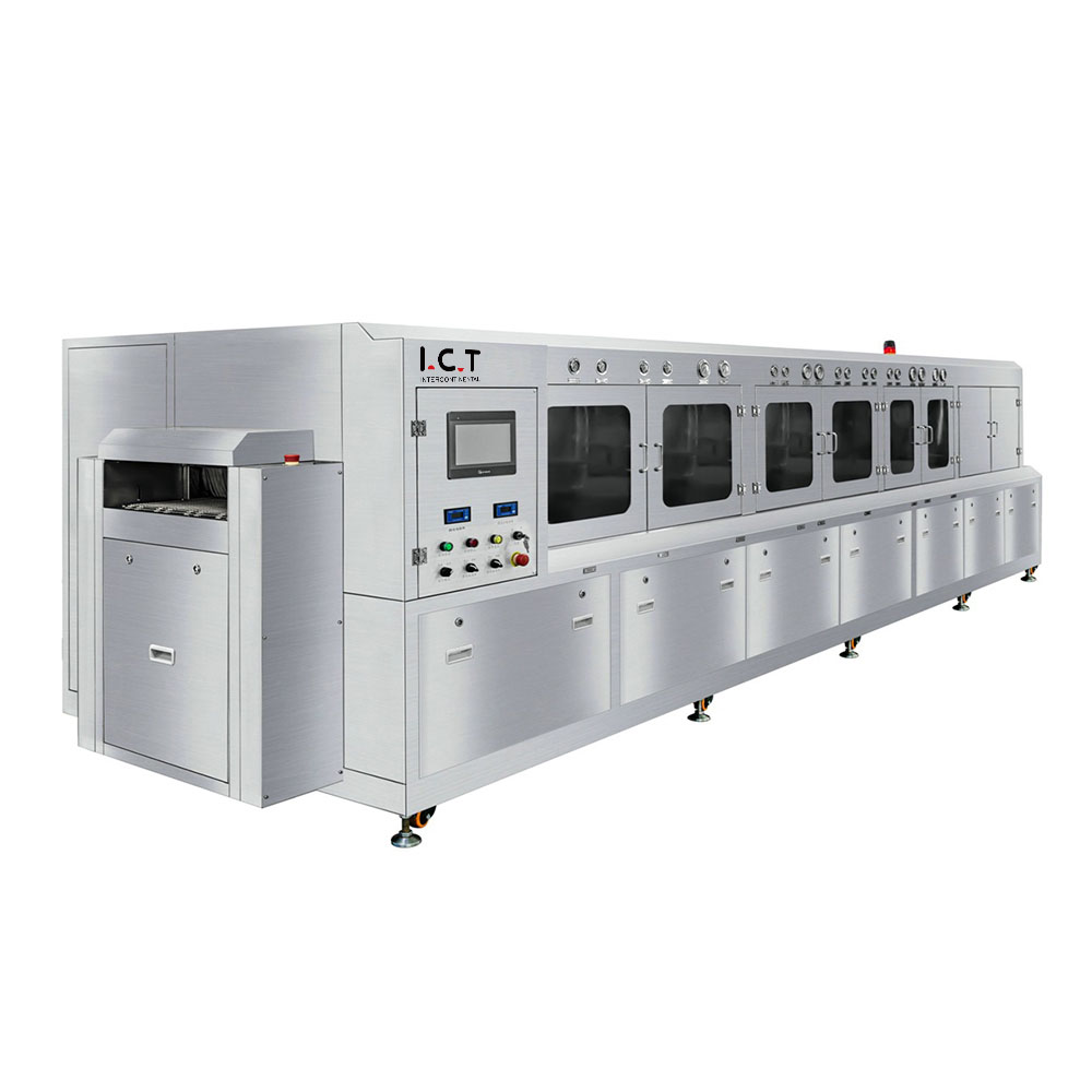 עבור נפחי ייצור גבוהים ומגוון רכיבים מינימלי, חומרי ניקוי מקוונים I.CT-6300 הם פתרון חוסך זמן וחסכוני בעת ניקוי רכיבים אלקטרוניים. לוחות המעגלים המודפסים פועלים אוטומטית על מסוע דרך שלבי התהליך האישיים, שם ניקוי, שטיפה וייבוש מתקיימים בתאים נפרדים.