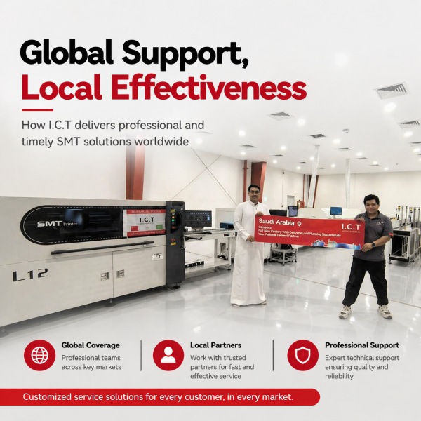 בשווקים כמו ערב הסעודית , שבהם המומחיות המקומית של תעשיית SMT עשויה להיות מוגבלת, ICT נכנס כדי לספק תמיכה טכנית מקיפה. הצוות שלנו לוקח אחריות מלאה על התקנה, הדרכה ופתרון תקלות, ומבטיח שהלקוחות יקבלו שירות מקצועי ובזמן ישירות מהמומחים שלנו.